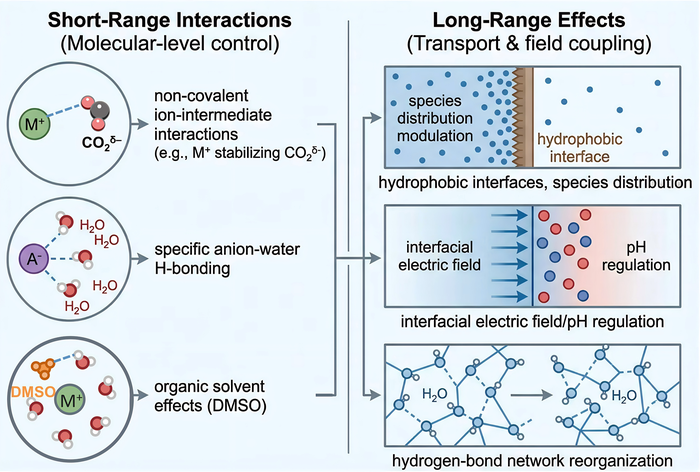 团队跳出静态的、以催化剂为中心的优化范式,提出“催化剂的理性设计必须与界面微环境的精准调控相结合”的核心原则,通过重塑界面微环境,实现对反应选择性和活性的精准控制。团队从多尺度视角系统阐明了界面微环境调控的核心机制,其中短程相互作用直接影响中间体稳定性和质子耦合电子转移过程,长程效应则决定了反应物和质子的浓度分布与传输效率。
