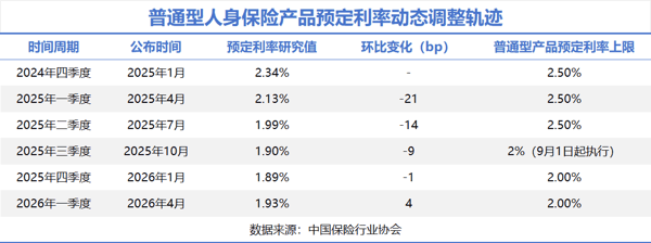 然而,2026年一季度,普通型人身保险产品预定利率自2025年的1.89%回升至1.93%,环比上行4个基点,不仅打破了此前的连跌态势,创下自中保协公布预定利率研究值以来的首次上行,也为行业未来的产品开发与负债成本控制提供了新的预期管理依据。