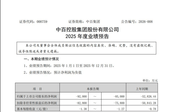 《每日经济新闻》记者注意到,中百集团2025年实际亏损额超出了此前预期。根据公司1月底发布的业绩预告,预计2025年归属于上市公司股东的净利润亏损8.5亿元至9.2亿元。而最终年报公告的9.57亿元亏损额,突破了预告上限。