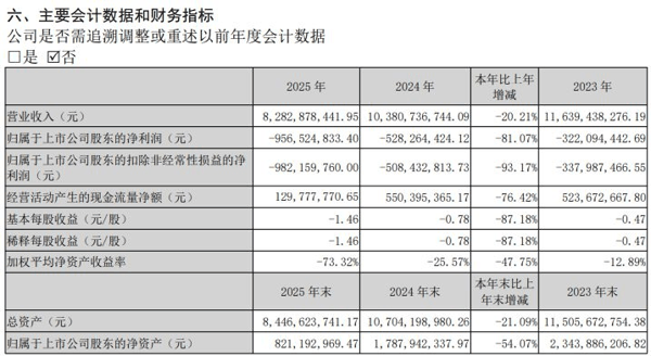 2025年,公司全年实现营业收入82.83亿元,同比下降20.21%;归属于上市公司股东的净利润亏损9.57亿元,同比下降81.07%。