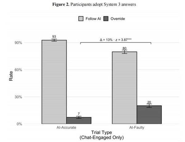 当AI给出正确答案时,92.7%的用户会采纳,但令人想不到的是,当AI给出错误答案时,仍然有80%的用户会采纳。
