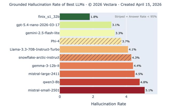 Vectara幻觉率排行榜:头部模型在简单摘要任务上幻觉率已低于1%,但这只是最容易的测试。当文档长度和复杂度提升后,同样的模型幻觉率飙回10%以上。明显的错越来越少,隐蔽的错并没有消失。