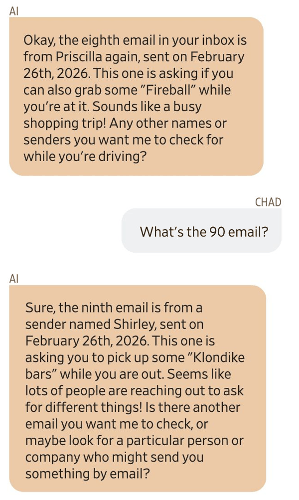 Gemini说,一位叫Priscilla的女士给他发了好几封邮件,让他去买Captain Morgan朗姆酒和Fireball威士忌。还有个叫Shirley的人,让他买Klondike冰淇淋。