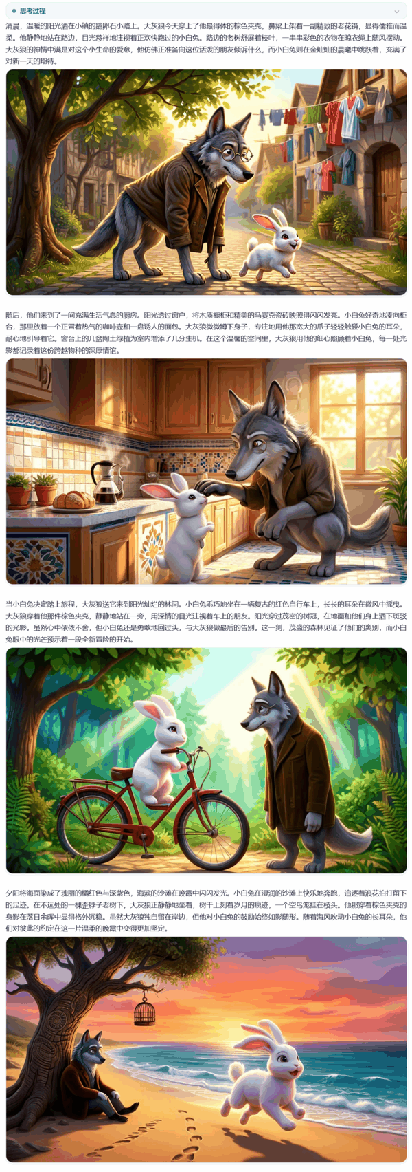 从结果可以看出,SenseNova U1 Lite 可以一边推进故事情节,一边同步生成对应场景的插图,图和文本来自同一套思维过程,逻辑连贯、风格统一。