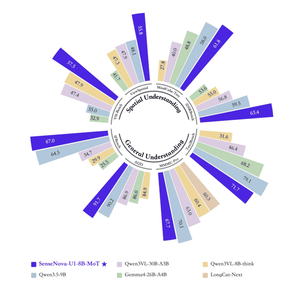 在图像理解与生成基准测试中,SenseNova-U1-8B-MoT 的表现相当亮眼。虽然它只是 8B 级模型,但在通用理解、空间理解等多个测试中都取得了领先成绩,甚至超过了 Qwen3VL-30B-A3B、Gemma4-26B-A4B 等更大规模模型。简单说,SenseNova-U1-8B-MoT 并不是靠堆参数取胜,而是在较小体量下做出了更高效的多模态理解能力。