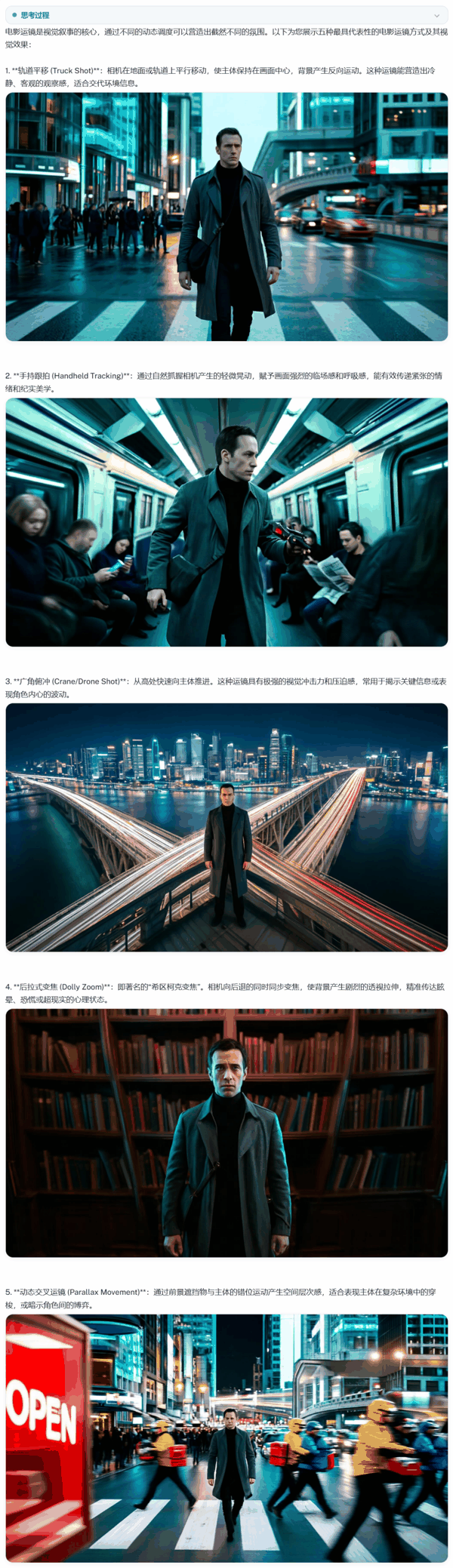 想学习电影运镜,也可以向 SenseNova U1 Lite 提问,它会把文字解释和视觉图同步给你,并且保持人物角色的高度一致性。这比单纯的文字教程好懂得多,也比纯图示来得有逻辑。