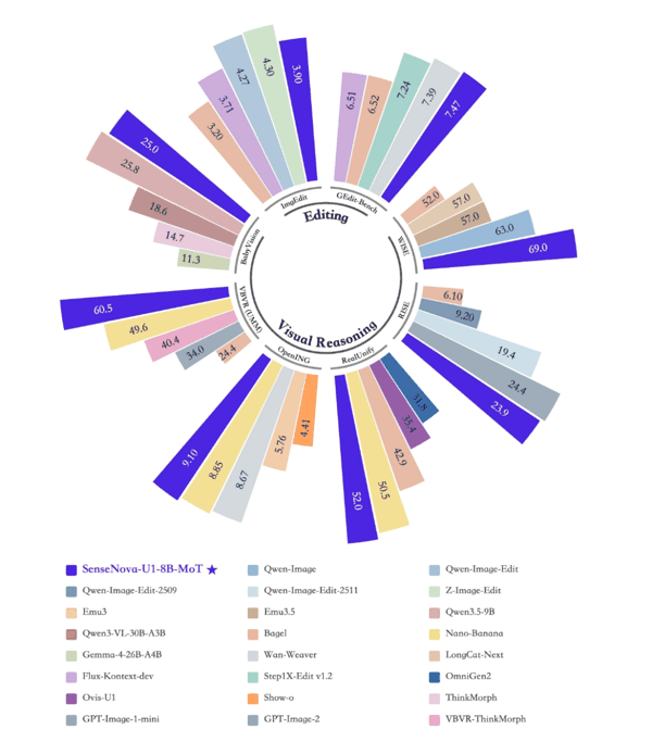 这也是 SenseNova-U1-8B-MoT 值得单独拿出来看的原因。8B 级别的模型规模并不算大,但它在图像生成、图像编辑、复杂信息图、视觉推理等任务中,能够接近甚至追上部分大型商业模型。背后的关键,并不是简单小参数逆袭大模型,而是统一架构让计算利用率更高,模型不需要花太多能力去弥补模块割裂带来的损耗。