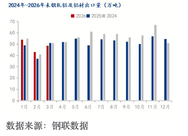 据海关数据显示,今年一季度国内铝材出口扭转了去年的下滑颓势,实现由降转升,铝材出口145.6万吨,同比增6.5%。2025年一季度铝材出口128.6万吨,下降8.7%。