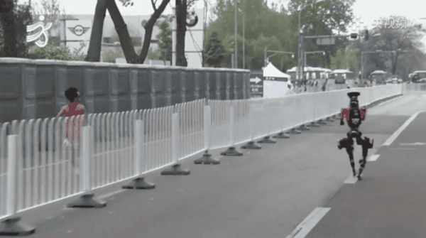 赛道上另一个名场面,真人跑者和机器人并肩竞速,结果机器人一个加速直接超过了人类选手。画面定格的那一刻,堪比一幅世界名画。