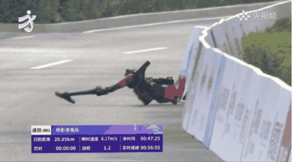 紧急抢救上线,担架小哥都已经冲进赛道了,在工程师的帮助下,它自己又颤颤巍巍地爬起来完成了撞线。于是,第一只冲线的机器人出现了。