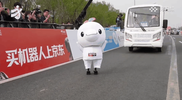 由于是间隔出发,前面的机器人已经跑完,后面的队伍还没发车。中段出现了一台小鼻嘎机器人,手里还拿着奶瓶,主打一个萌系赛道。话说身高这么矮的机器人,到了终点真能够得到撞线的那根线吗。
