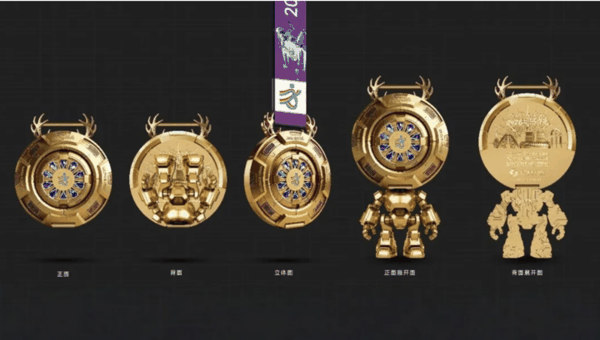 金属机甲风的设计基调,通体锻造质感,线条硬朗,结构错落。更有巧思的是中间那块可展开结构,拉开之后整块奖牌直接化身一台立体的小人形机器人。