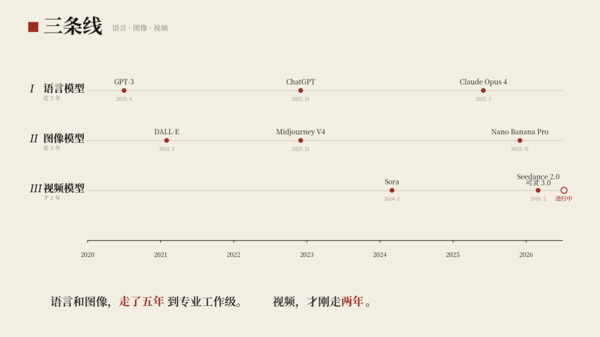 大语言模型那条线从2020年的GPT-3开始,五年后走到了程序员每天在用的助手。图像模型那条线从2021年的DALL-E开始,同样大约五年,走到了设计师每天在用的生产工具。视频模型那条线从2024年2月的Sora开始,到今年2月的Seedance2.0和可灵3.0。这条线才走了两年。
