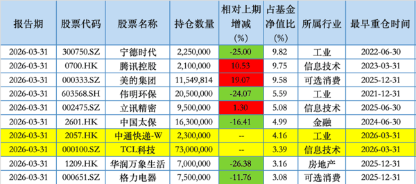 其中,中通 快递 、TCL科技首次进入持仓前十。相较于2025年末,赵枫在2026年一季度期间增持了60万股的中通 快递 ;而他在2025年下半年首次建仓TCL科技后,在2026年一季度期间再增持了4300万股。