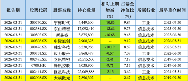 具体来看,2026年一季报显示,睿远成长价值混合的前十大重仓股依次为 宁德时代 (300750.SZ)、 东山精密 (002384.SZ)、 新易盛 (300502.SZ)、 中际旭创 (300308.SZ)、 胜宏科技 (300476.SZ)、 迈为股份 (300751.SZ)、 立讯精密 (002475.SZ)、 腾讯控股 (00700.HK)、 巨星科技 (002444.SZ)、 大族激光 。