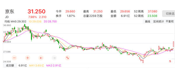 从股价表现来看,京东自去年10月起持续承压下行,今年3月在触及阶段低点后开始震荡反弹。