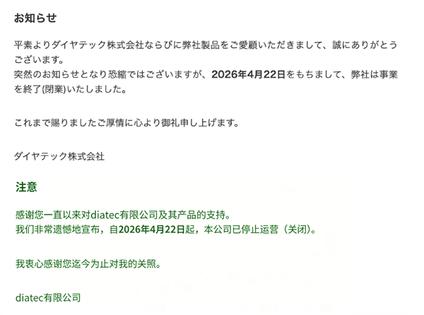 Diatec 就是 Filco 所属的公司,4 月 22 号突然宣布停业不干了 ↓ ↓