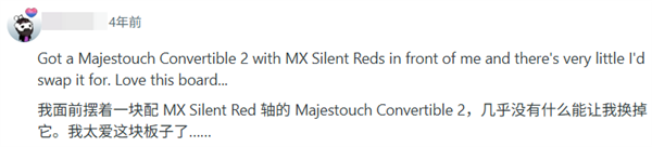 一则 2014 年 12 月宣传报道中,就有这样的描述:“ 这款键盘的主要卖点是德国 Cherry 轴,采用的按键开关类型是 MX 触感开关……由于这些特性,无需将按键完全按下即可输入,因此适合高速打字和长时间打字 ”。