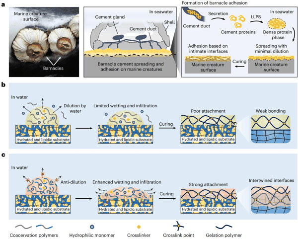 水下或潮湿环境中的牢固粘附是材料科学领域的长期挑战。传统粘合剂易受水合层阻碍或发生水溶胀,尤其在含水量高的水凝胶、含脂质的生物组织等基底上表现不佳。研究团队从藤壶的天然粘附机制中获得灵感——藤壶通过分泌蛋白质形成液-液相分离的凝聚体,实现水下高强度粘附。