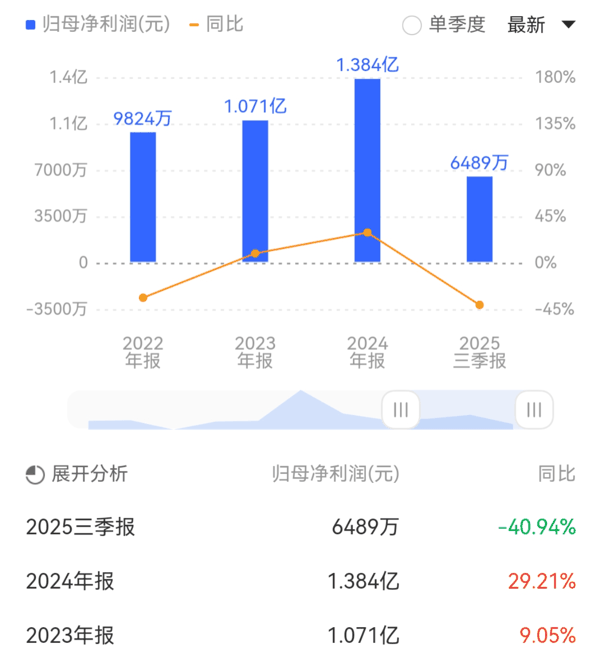 利润端的情况则更为严峻。前三季度归母净利润6489万元,同比大幅下滑40.94%;扣非净利润同比下降近四成。若聚焦第三季度,归母净利润仅2142万元,同比锐减逾53%。除关税冲击外,研发费用的持续加码,也进一步挤压了公司当期的盈利空间。