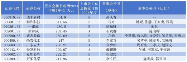 最高的瑞丰新材董秘拿404.9万,最低的硅烷科技董秘才4.4万,差了90多倍。这主要取决于公司规模和董秘能力,万华、新和成这些大公司董秘年薪基本都在200万以上。
