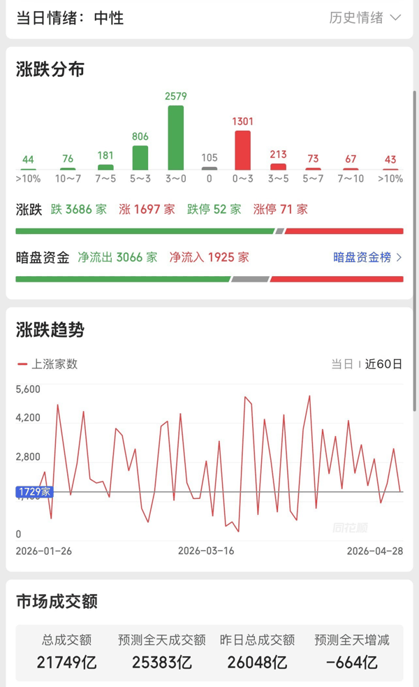 A股市场在连攀阶段高位后出现调整。盘面结构上,此前持续领涨的科技主线明显回撤,部分AI热门股的业绩成为引导市场风向转变的催化因素。展望4月最后一周,券商策略报告普遍认为,外部风险扰动趋弱、国内经济基本面修复、流动性预期向好等因素共同支撑A股韧性。从短期维度看,部分焦点板块的筹码集中度已提升至历史高位,叠加五一小长假临近,市场风险偏好可能有所收敛。但在中长期视角下,全球科技产业共振与国内企业盈利修复逻辑未变,科技成长赛道的高景气度有望得到进一步验证。