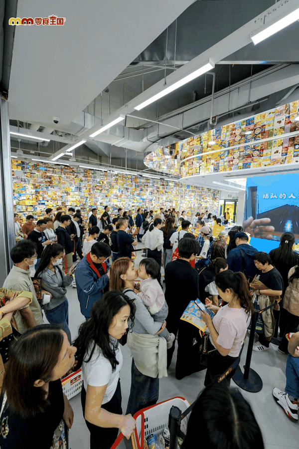 区别于传统零食店的陈列式售卖,“零食王国”更像是一张被展开的“零食寻宝图”,通过“零食长廊”、“泡面之城”、“水饮小镇”、“全球零食站”、“零食博物馆”、“零食很大”、“零食很小”等十几个主题空间设置,形成“可买、可逛、可拍、可玩”的探索路径。
