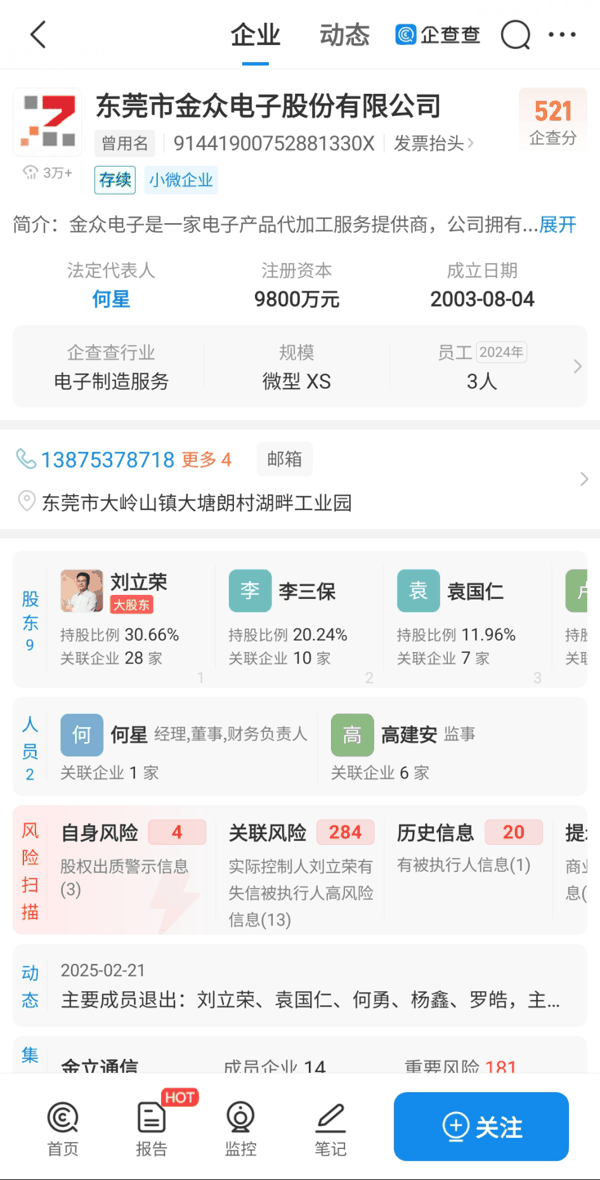 企查查信息显示, 2 025 年 2月,金立集团旗下的东莞市金众电子股份有限公司曾发生高管变更,何星出任该公司法定代表人、董事、财务负责人及经理;刘立荣虽退出高管行列,却仍以 30.66% 的持股比例, 成为 第一大股东。