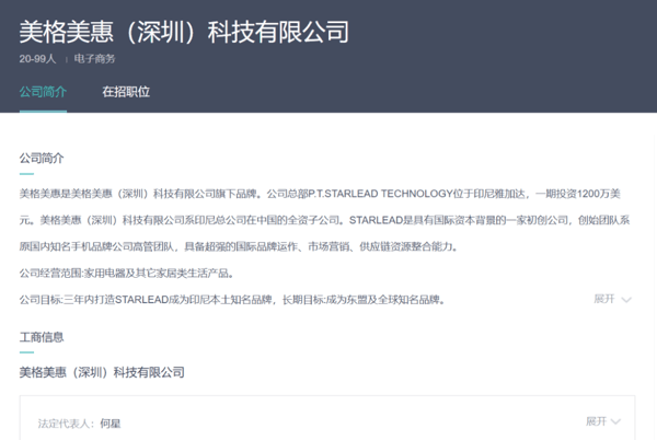 目前, Starlead 已在国内设立分公司 ,即 美格美惠(深圳)科技有限公司,企查查信息显示,何星为该公司第一大股东,持股比例达 50%。