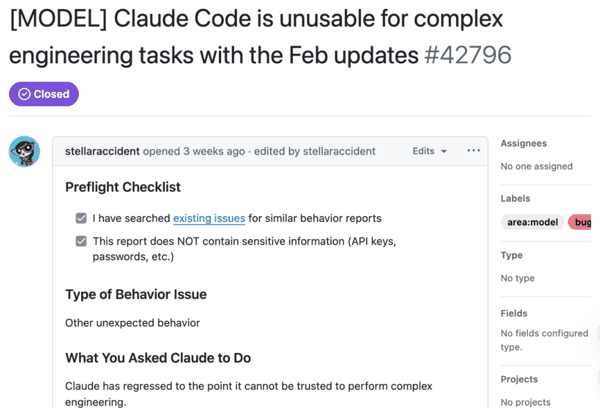具体的故事情节要从今年 3 月开始说起,那时候就有网友陆续在 Hacker News、Reddit 等社区吐槽 Claude Code 正变得越来越慢、越来越笨,直言 「Claude Code 甚至已经退化到无法用于复杂工程任务的地步」。