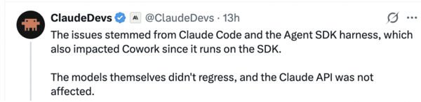 Anthropic 表示,其实这些问题源自 Claude Code 和 Agent SDK 的运行框架(Harness),而由于 Cowork 也是基于该 SDK 运行,因此同样受到了影响。 「模型本身并没有出现能力退化,Claude API 也未受到影响。」