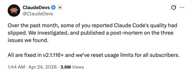 「在过去一个月里,一些用户反馈 Claude Code 的质量有所下降。我们对此进行了调查,并发布了一份事后复盘报告,总结了发现的三个问题。」