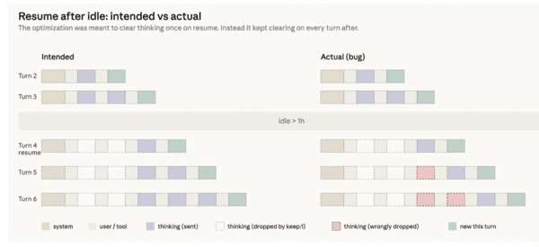 3 月 26 日,Anthropic 上线了一项改动,出于优化会话闲置时的清理逻辑,对超过一小时未使用的会话,在用户重新进入时清理旧的「思考」内容,以降低恢复会话时的延迟。