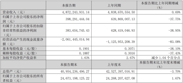 C114讯 4月28日消息(颜翊)中航光电发布2026年第一季度报告。报告期内,公司实现营业收入48.72亿元,同比增长0.69%;归属于上市公司股东的净利润为3.98亿元,同比下降37.75%;扣除非经常性损益后的净利润为3.84亿元,同比下降38.95%。经营活动产生的现金流量净额为-20.61亿元,净流出幅度同比扩大83.08%。
