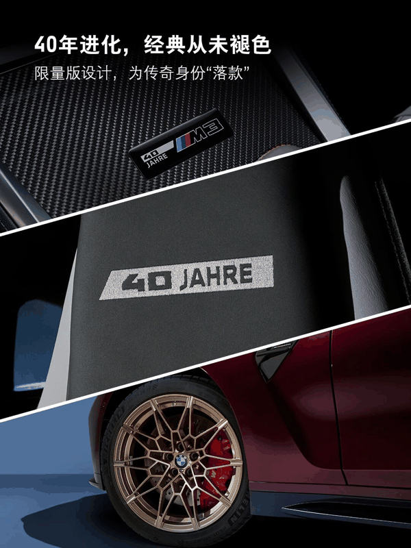 首次引入独有黑色外框双肾进气格栅搭配熏黑车灯组件,车顶、迎宾踏板、前排座椅头枕及中央杯架配有 “40 周年限量版”专属徽标 ,标配 BMW M 碳纤维桶形座椅及带有加热功能的 BMW M 多功能 AIcantara 方向盘。