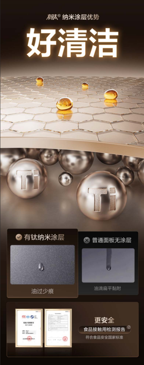 钛金属表面还具有独特物理特性——疏水疏油。微观世界下,钛金属表面能级较低,使水和油分子难以铺展附着。通俗来说,油污和水滴落在表面时无法抓住金属,而是形成圆润珠子滚落。这一特性完美解决厨房清洁难的痛点。传统灶具油污易渗入缝隙,干结后极难清理;而苏泊尔有钛防爆灶得益于钛金属疏水疏油特性,油污无法附着,水渍一抹即净。无论是烹饪后汤汁飞溅,还是长期油垢积累,只需轻轻一擦即可光亮如新。苏泊尔用钛重新定义安全厨房:烹饪不再小心翼翼,厨后清洁无需费力擦拭,轻松下厨更从容。