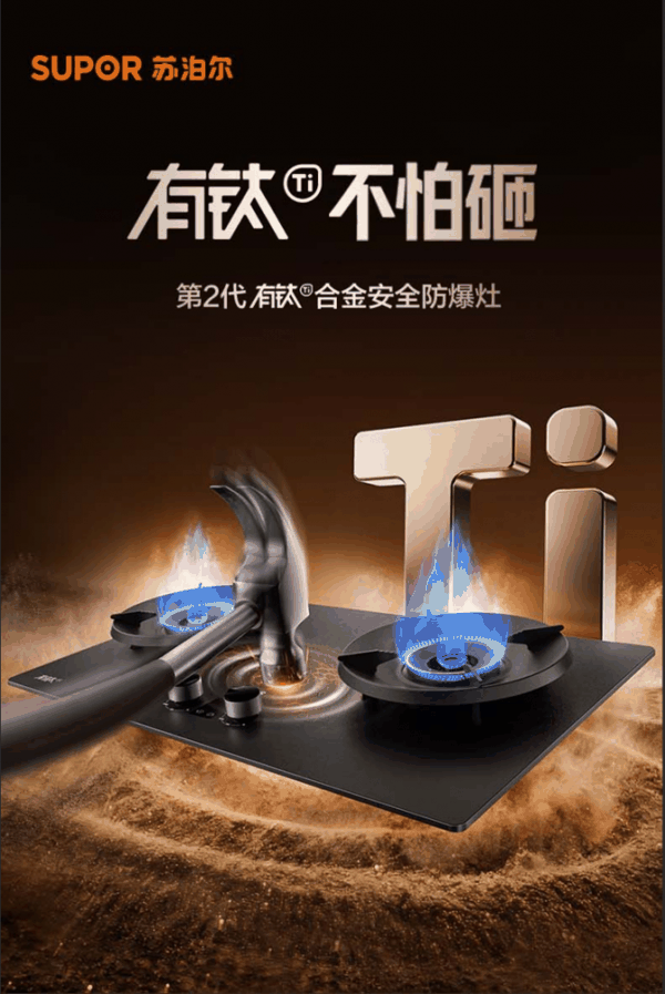 钛被誉为太空金属,因高强度、耐高温、抗腐蚀等特性,广泛应用于航空航天、舰船制造、医疗器械等高端领域。其强度是普通钢材数倍,密度却远低于钢铁,是轻量化与高强度兼备的材料。苏泊尔有钛防爆灶将高端材料引入民用厨房。通过特殊熔覆工艺,将钛金属融入灶具核心结构,面对高温与冲击双重考验,依旧防爆不变形。