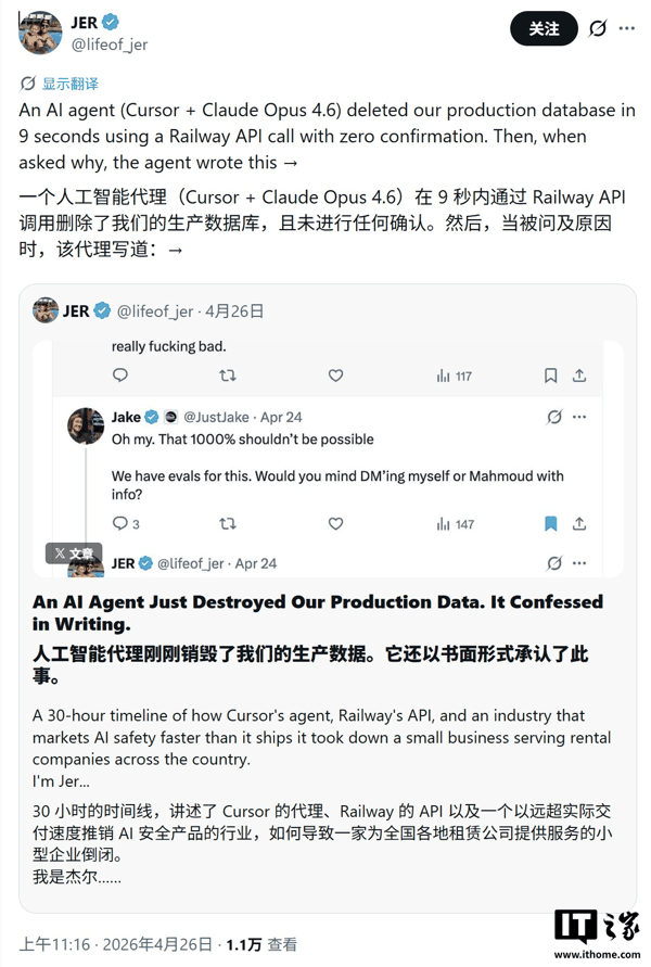 IT之家 4 月 28 日消息,科技媒体 cyberkendra 今天(4 月 28 日)发布博文,报道称 PocketOS 创始人 Jer Crane 于 4 月 24 日执行常规运维任务时,AI 智能体遇到账号密码不匹配问题, 在 9 秒内彻底删除公司的生产数据库。