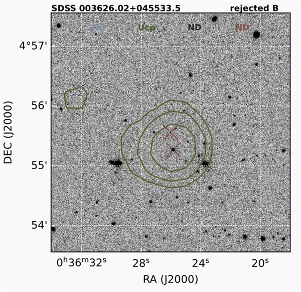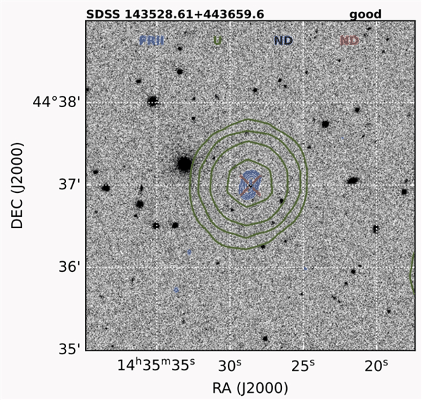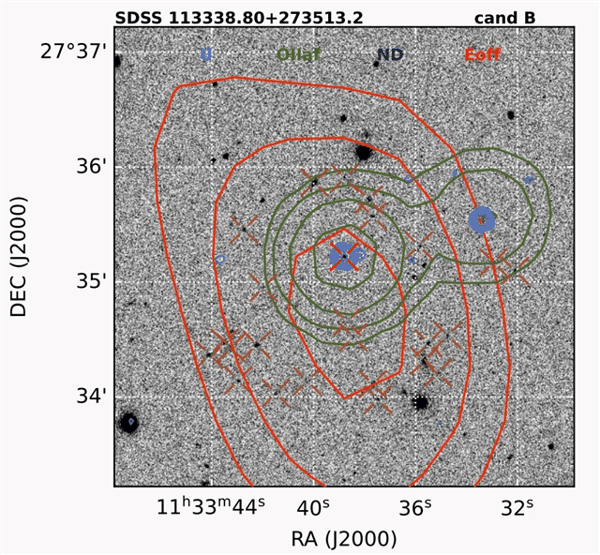 图1:光学图像(黑白背景)与多个射电巡天结果(射电亮度等值线)的叠加示意图,展示高红移类星体与射电源之间的空间对应关系。红色斜十字表示光学确认的高红移类星体,暗红色与棕色十字表示前景类星体或星系。上方两幅图展示了可靠样本的匹配情形,左下为候选样本,右下为最终排除的误匹配样本示例。