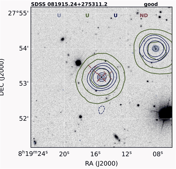 进一步分析显示,在可靠样本中,约95%的高红移射电类星体在射电图像中呈现致密结构(如图1 右上示例源),这一比例明显高于低红移类星体。这表明在宇宙早期,射电喷流往往仍处于“年轻”阶段,尚未发展成大尺度结构;或者,其延展射电瓣在高红移条件下会受到宇宙微波背景辐射造成的能量损失,从而变得难以探测。另外,本研究所建立的样本还具备显著的人工智能(AI)拓展潜力:生成的逐源光学-射电叠加图(如图1)可作为高质量训练样本,为未来借助AI技术从海量样本中快速识别射电对应体提供了重要的方法基础。