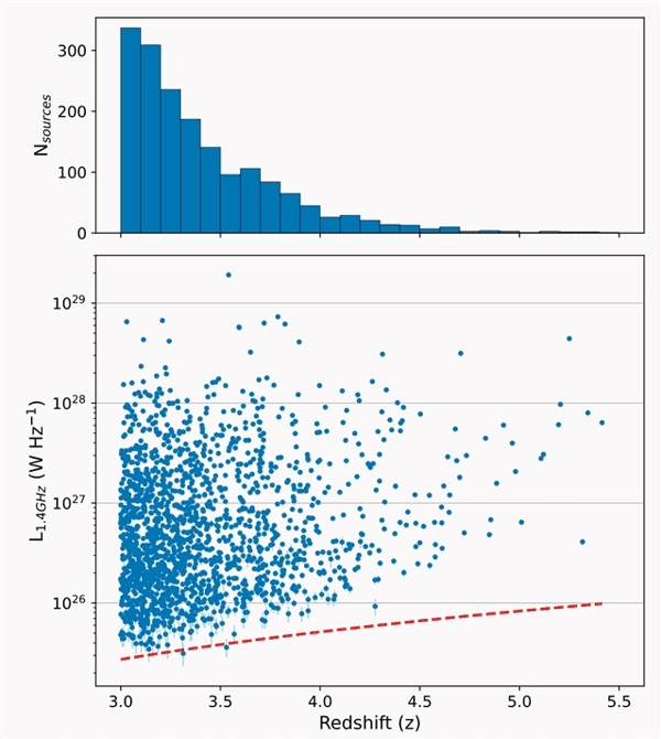 图2:样本中射电类星体的红移分布,以及射电光度(Luminosity)随红移变化的关系。红色虚线表示射电巡天探测极限对应的光度变化。