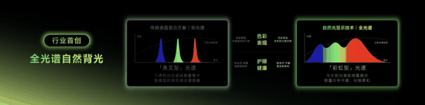 盯着屏幕看久了,只要抬头看看窗外自然景色,眼睛瞬间就舒服多了,这是因为真实环境下的自然光是柔和的、有“呼吸感”的,其光谱形态是连续波浪式曲线的「彩虹型」;但电视等电子设备发出的光是人造光,虽然能带来鲜艳的色彩表现,但它的光谱是尖锐的「鱼叉型」,会强烈刺激我们的视神经,往往一部好片子还没看多久,眼睛就会出现不适现象。而创维「自然光显示技术」采用了全光谱自然背光,在RGB三色背光外增加了“W”全光谱白光,能够使画面观感贴近真实的自然光,色彩显示更加柔和,观看体验更舒适。
