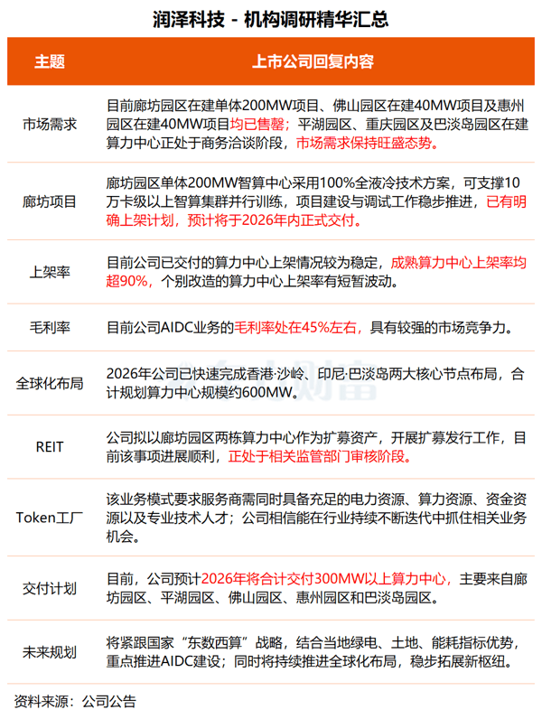 关于今年交付规模以及境外计划,润泽科技表示,目前公司预计2026年将合计交付300MW以上算力中心,主要来自廊坊园区、平湖园区、佛山园区、惠州园区和巴淡岛园区。后续公司将以订单驱动、战略布局为原则,在 电力 、政策、区位具备优势的地区,通过自建、并购或合作方式落地新节点,扎实推进公司全球化算力网络布局。