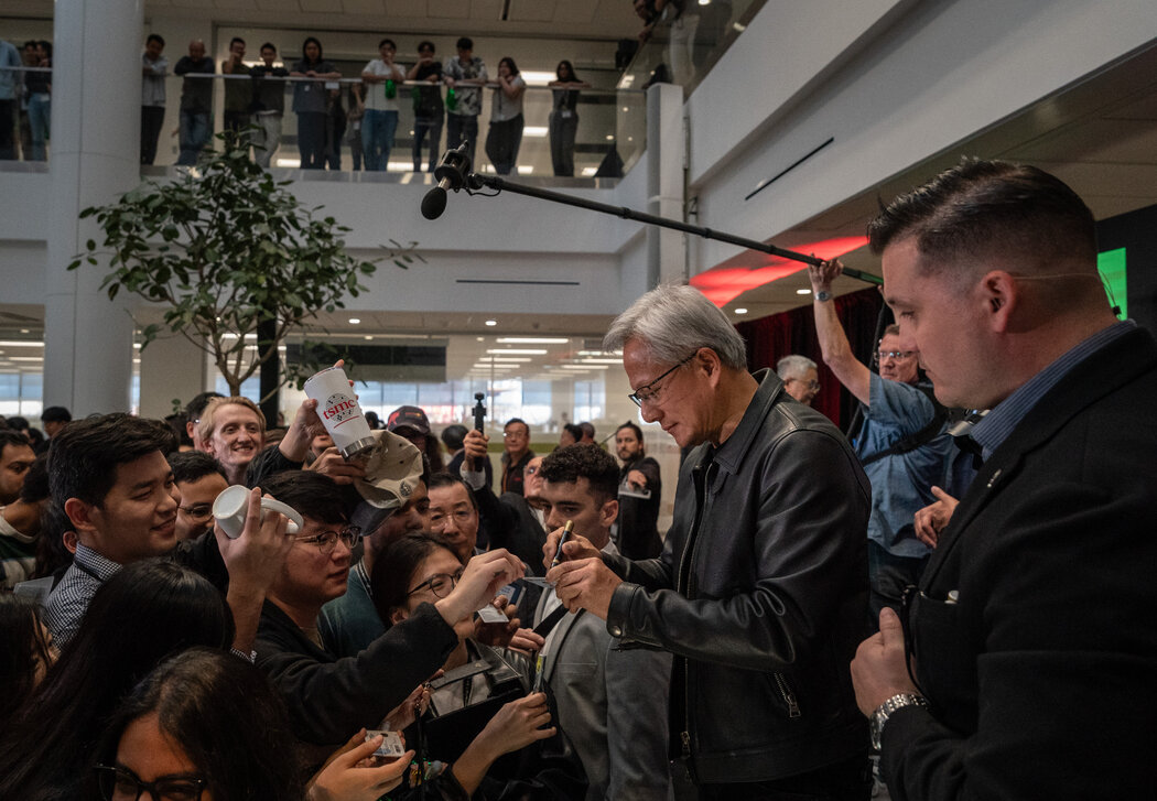 去年10月,英伟达首席执行官黄仁勋在台积电菲尼克斯工厂发表演讲后,为台积电工人签名。此次活动是为了发布美国制造的首个人工智能芯片晶圆。 Loren Elliott for The New York Times