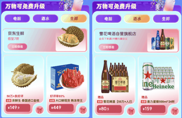 此外,京鲜生泰国进口金枕头鲜榴莲,果肉饱满、香甜软糯,是家庭聚会或自驾出游的热门水果选择,5-6斤1个装到手价149.9元;雪花啤酒经典老雪则以经典口感和冰爽体验适配假期聚会、自驾出行场景,整箱到手价80.3元,为五一假期的味蕾增添趣味。