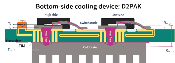 图3:不同功率封装的功率回路电感对比 诸如Q-DPAK等TSC封装还具备一项显著优势,即可在封装顶部直接连接散热器或液冷系统。 这种设计将散热路径与电气路径分离,从而提升散热效率,并降低热阻。借助TSC技术,功率器件和栅极驱动器可以布置在PCB的同一侧,其中,栅极驱动器在理想情况下位于底部。相比之下,器件的散热器则位于顶部,从而为设计提供更大灵活性和系统级集成度。