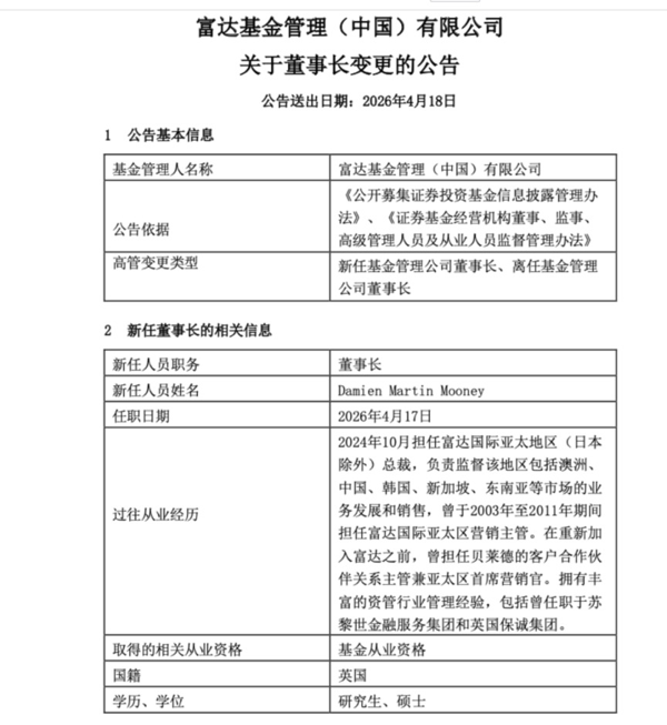 4月18日, 富达 基金公告更换董事长:李少杰离任, 富达 亚太区(日本除外)总裁莫达文(Damien Mooney)被任命为富达基金管理(中国)有限公司董事长,任期自4月17日开始。