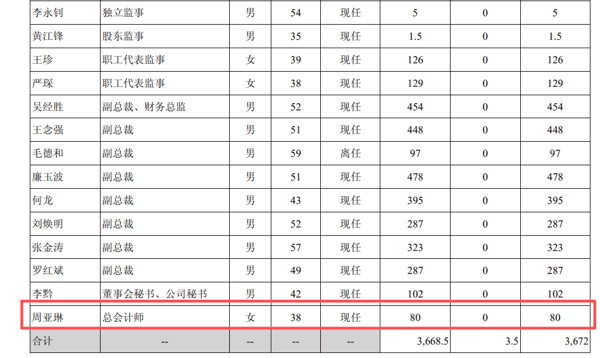 2014年11月,周亚琳升任公司总会计师。同年,她首次出现在公司年报的高管薪酬名单中,年薪为80万元。
