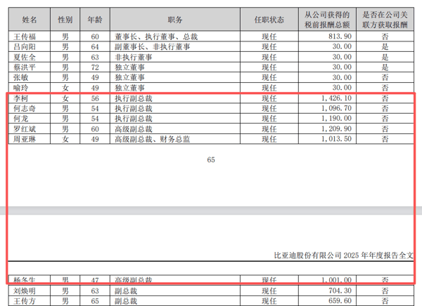 周亚琳的高薪也非“一枝独秀”。从2025年年报数据看,比亚迪有6位高管年薪超千万元。其中,公司执行副总裁李柯年薪最高,达1426.10万元。高级副总裁罗红斌年薪1209.90万元,执行副总裁何龙年薪1190.00万元。