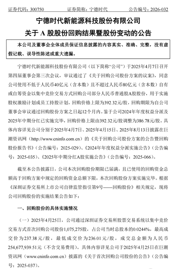 宁德时代:耗资43.86亿元完成股份回购
